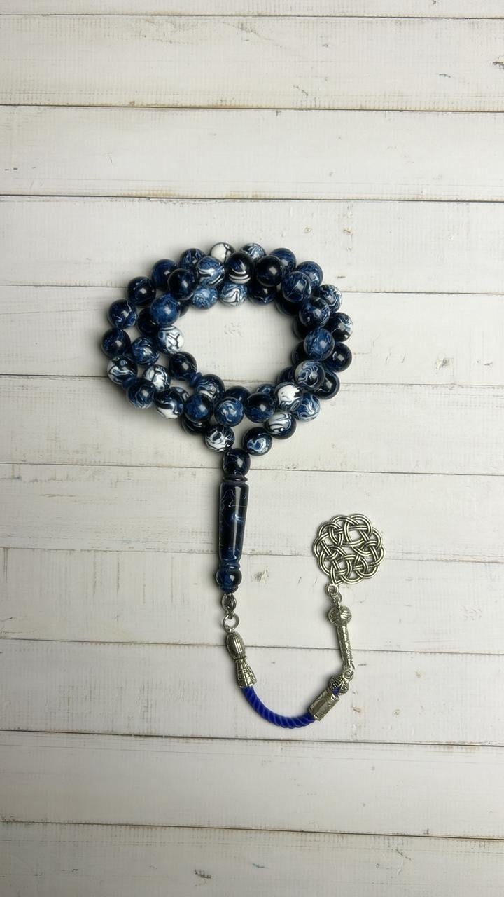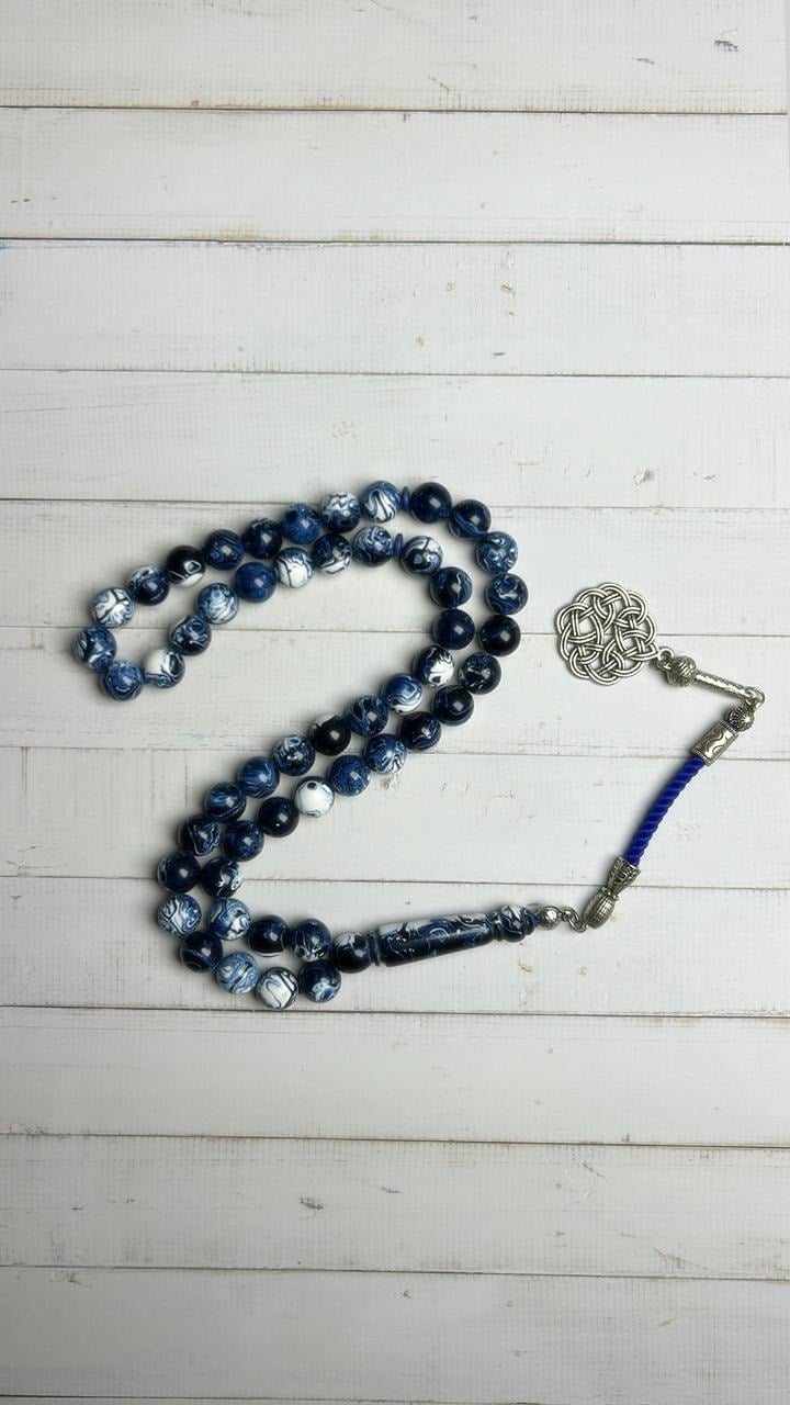 تموجات اللون الأزرق والأبيض تمنح المسبحة حضورًا لافتًا يعكس الذوق الرفيع لعشاق السبح الفريدة.