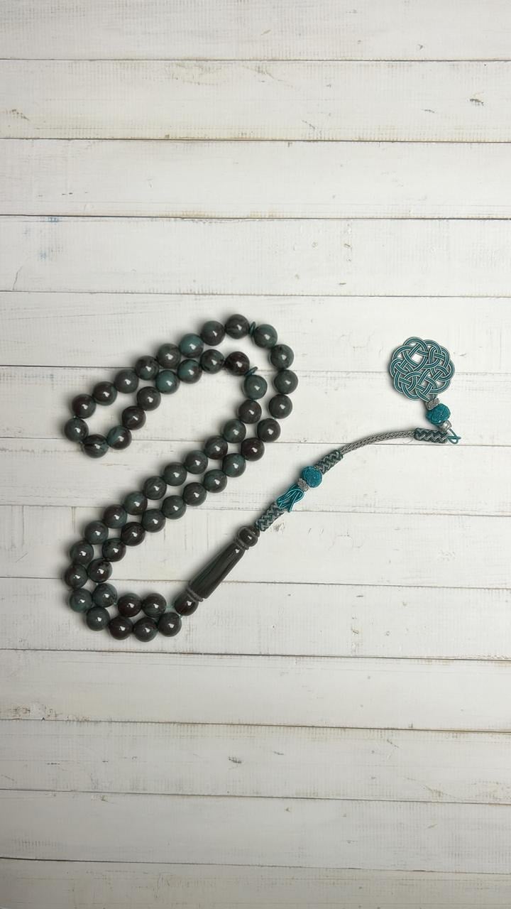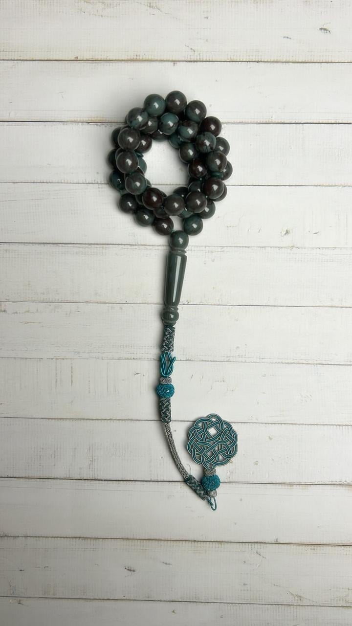 تتكوّن من 51 خرزة بقطر 10 ملم بخامة بكلايت أصلية عالية الجودة، بتموجات لونية أنيقة تمزج بين الزيتي العميق والبني الدافئ، لتمنحها طابعًا كلاسيكيًا فخمًا.