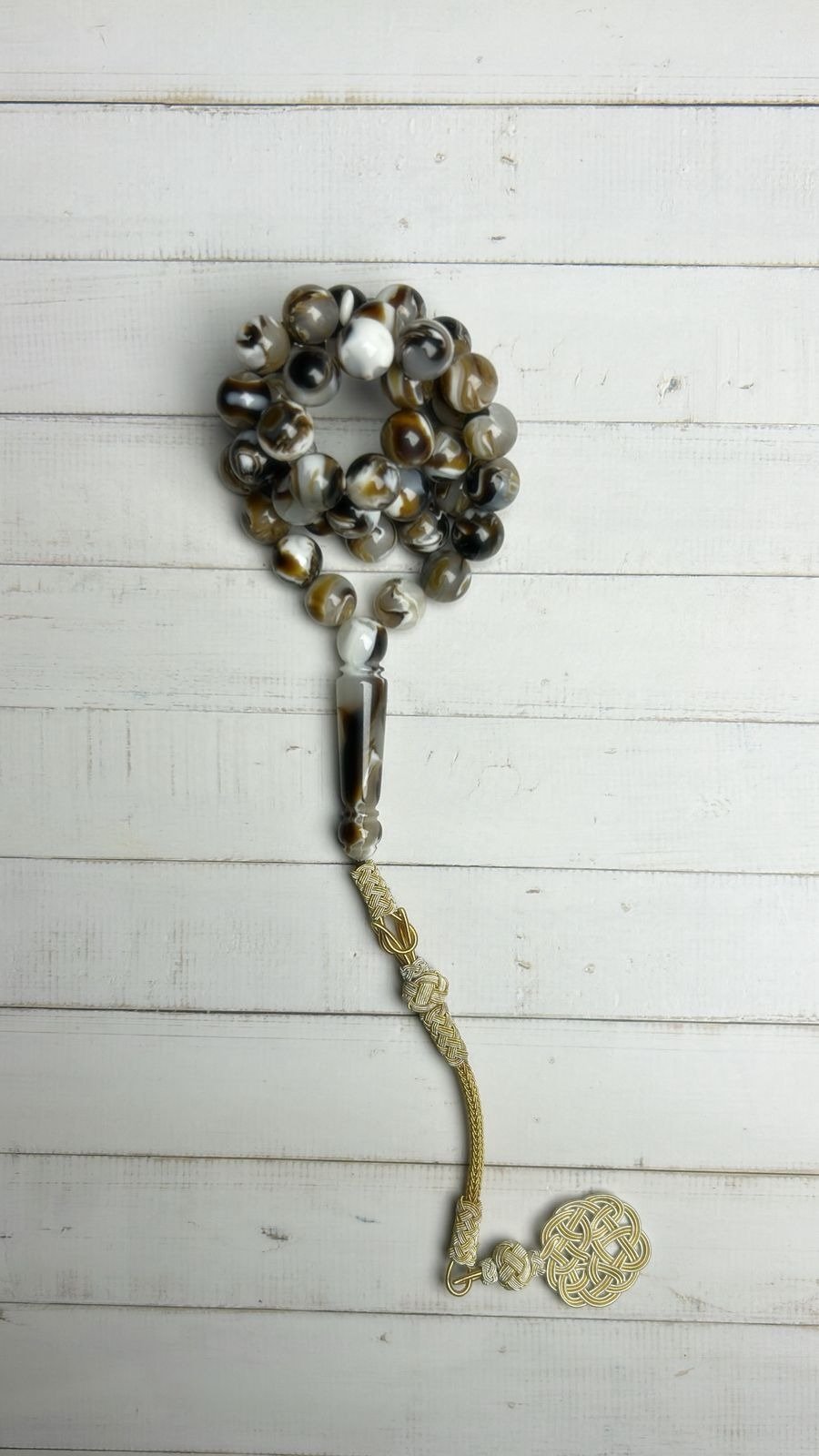 تتكوّن من 45 خرزة بقطر 10 ملم بخامة بكلايت أصلية، بتدرجات لونية أنيقة تمزج بين العودي الدافئ والرمادي الفاتح مع لمسات بيضاء تمنحها طابعًا فخمًا ومتوازنًا.
