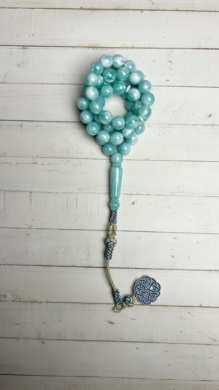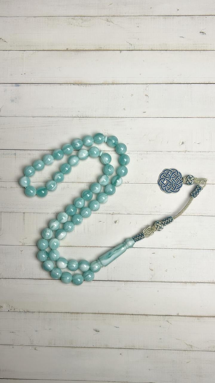 مسبحة بكلايت فيروزي فاخرة بتصميم طربزونة نحاس مطلي فضة، تجمع بين الجمال العصري والفخامة الكلاسيكية في قطعة واحدة.