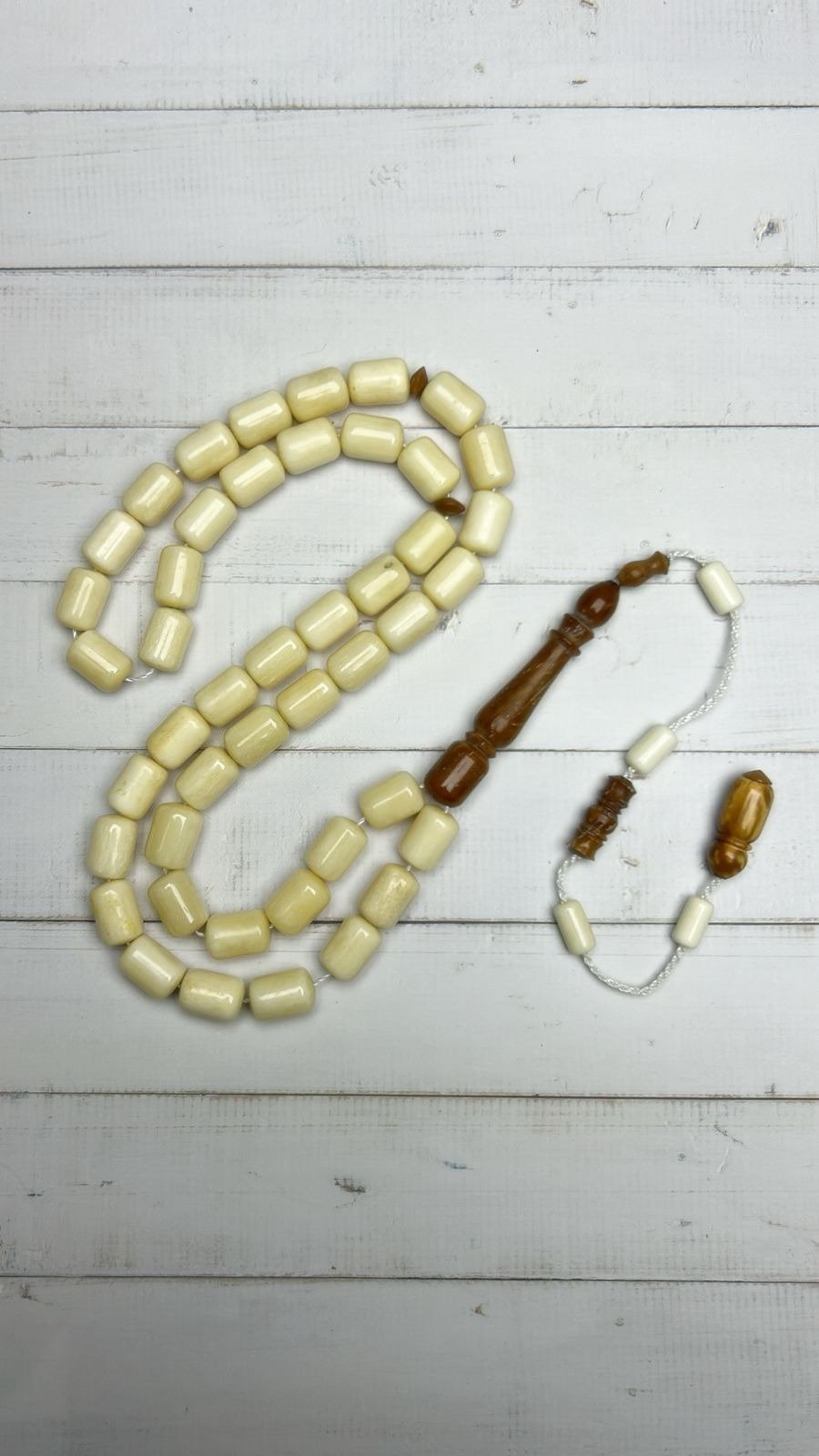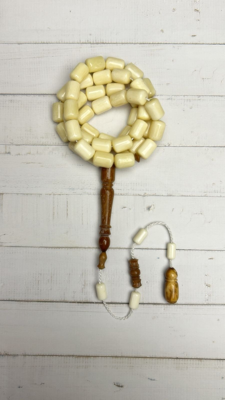 تتّسم الخرزات العاجية بلمعة ناعمة وأناقة راقية، مع لمسات من خشب الكوك الفاخر تضيف تباينًا جماليًا يعكس ذوق الرجل الكلاسيكي الأصيل.